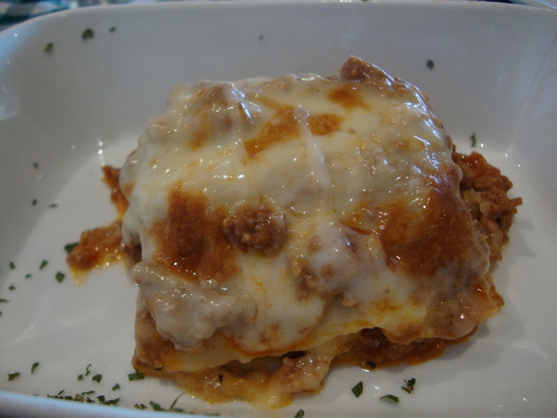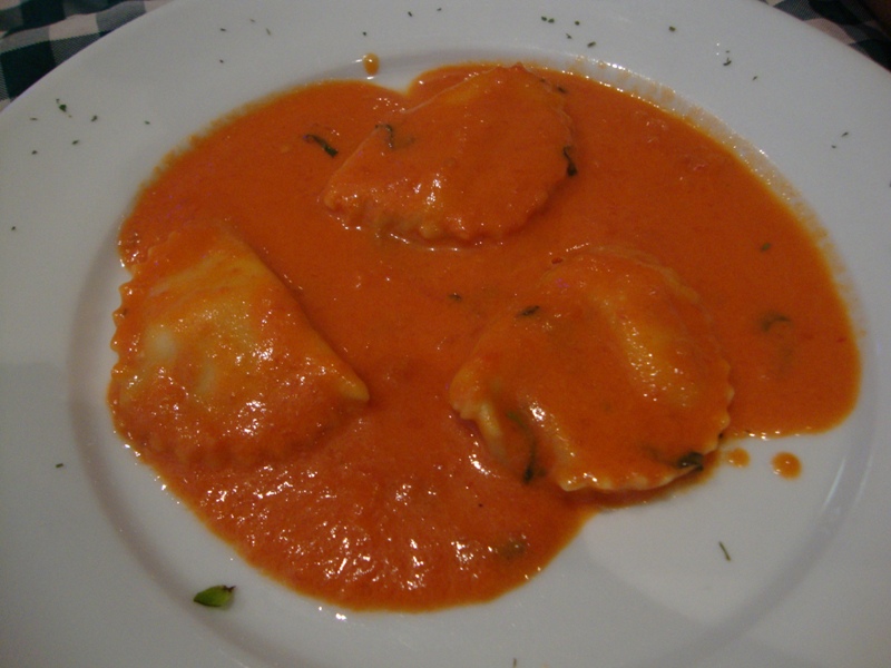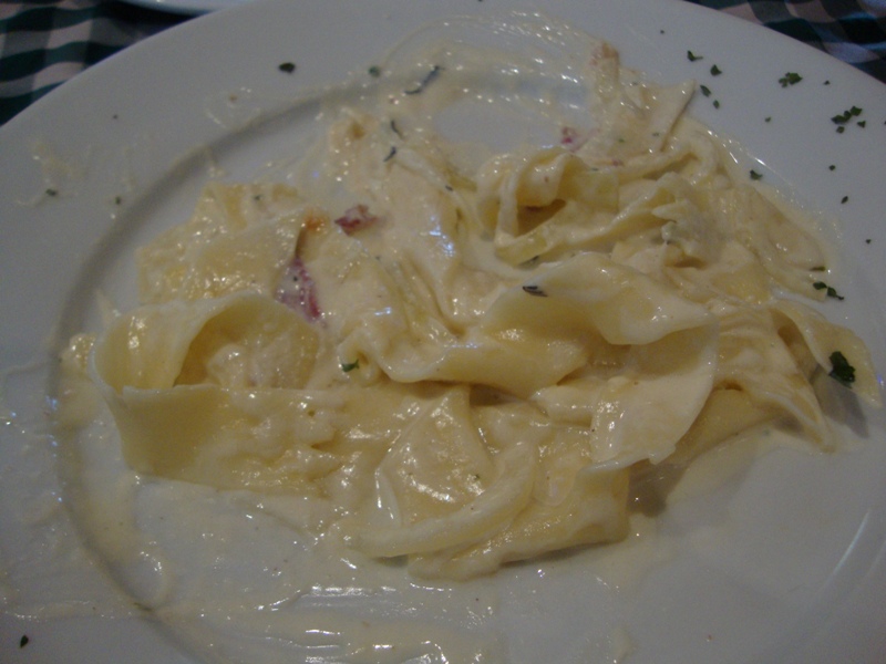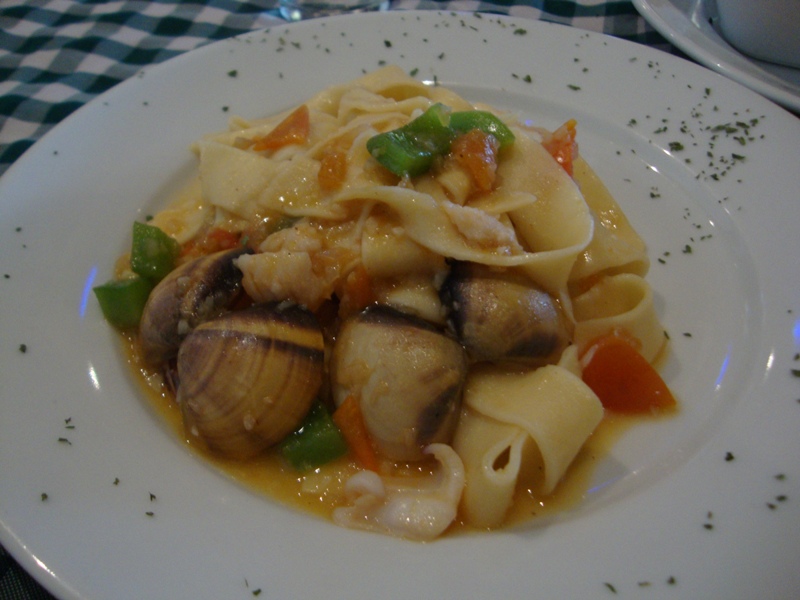 Talleghatti (sp?) with salmon, which is basically green fetuccini with cheese and nice fresh salmon, though eating it makes us think of Japanese, because it really has that fresh Japanese salmon taste to it