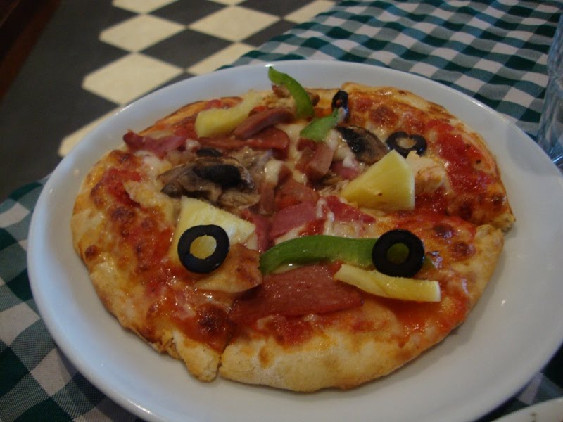 The Italian Job pizza, which pretty much explains it. Though my friend said that adding pineapples on pizza was actually an American invention, and a true Italian hates pineapples on their pizza. For me, I hate the olives. I don't like them, so I gave it all to my friend
