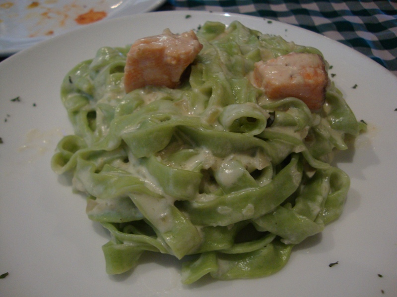 Talleghatti (sp?) with salmon, which is basically green fetuccini with cheese and nice fresh salmon, though eating it makes us think of Japanese, because it really has that fresh Japanese salmon taste to it