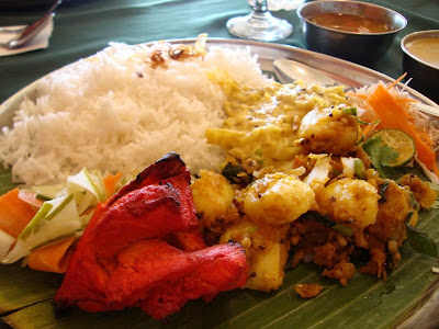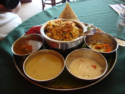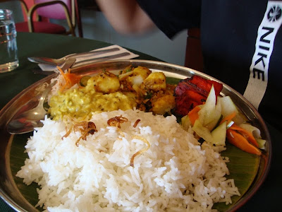 This is what my friends ordered: Nasi Briyani set, or something like that. They've got their briyani rice, which is spicy red and yellow rice with condiments like acar (pickled cucumber and carrot), wet coleslaw (or something like that), curry, tomato soup, chicken and naan (I think that's what it's called). It really is in a big portion and worth the money, and looks delicious.