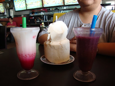 This is our drink. We ate together with a friend from Hong Kong, whom my friend knew via couch-surfing. She ordered bandung juice (rose syrup juice), he ordered coconut juice and I ordered sparkling blueberry