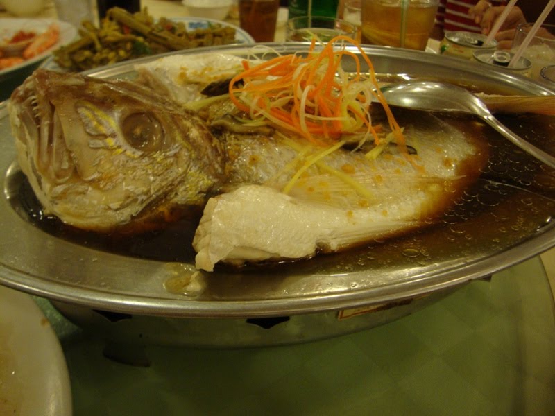 My fav dish that is a must-eat in seafood restaurant: steamed fish~!! Of course, for the benefit of rather than flipping the fish around (something to do with a Chinese superstition in which flipping the fish means flipping out the good luck), they requested the cook to cut the fish into butterfly style so it'll be easier for us to take the flesh. They let me eat the head, which tasted like pure heaven~! I just love fish head~!