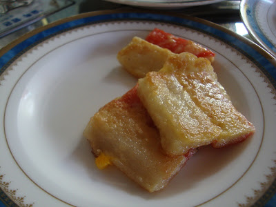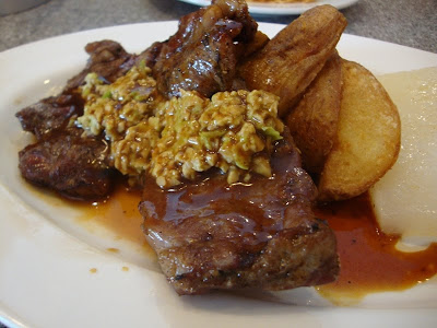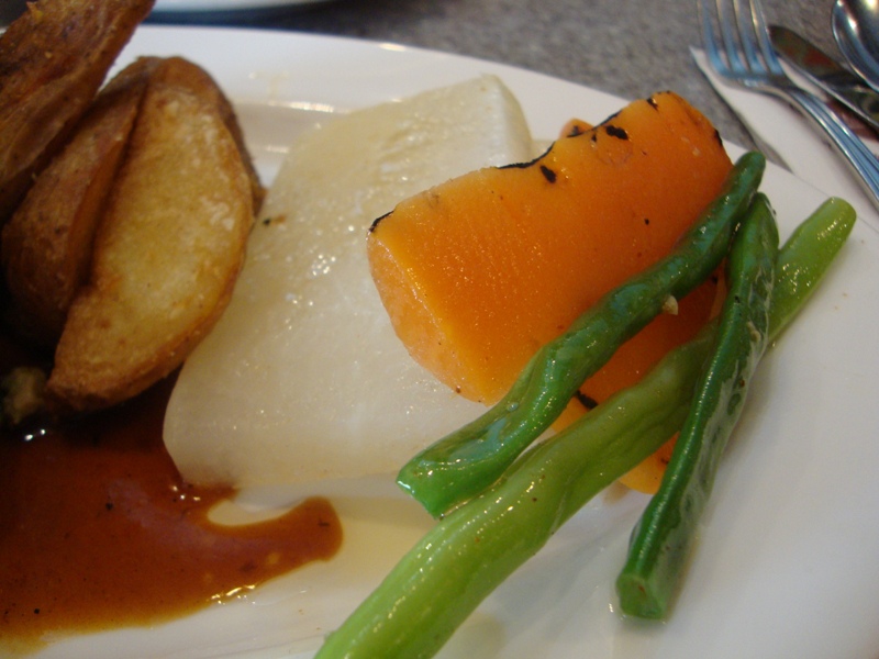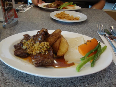 Here be our food, which is both beef steak. The meat was actually pretty small, and cooked to medium, more or less, but it was nice and thick and juicy, so still worth the money, though I wonder what the heck was that on the meat. It didn't seem like garlic, but it doesn't taste like avacado as my friend claims. And their radish is just big-ass HUGE!! What are they, having a surplus on radish and want to get rid of it or something? It also doesn't help that radishes is not exactly my fav veggie. I don't mind eating it, it's just not my fav XP