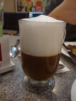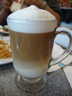 This be our drink: Cafe Au Lait and Cafe Latte. According to my friend, they're both the same, meaning coffee with milk. Only his is French while mine is Italian. LOL! Had to add sugar coz it's bloody bitter, though I think the coffee still ends up overpowering the sugar... -_-'''