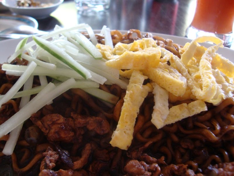 This is what I ordered, and it has almost the same pronounciation as the Chinese counterpart of this dish: Ja Jian Mian, which basically translates as noodles in fried sauce. The obvious difference between the Korean version and the Chinese version is that for the Chinese version, the noodle is clear and you have to mix it together with the layer of mince meat fried sauce on top of it, and the condiments is usually just cucumber and carrot strips, whereas here, Korean version is that the noodles is already mixed together with the sauce and we have egg strips instead of carrot strips. Ah well, to each its own. It tastes pretty good anyways, though I can't shake off the nagging feeling that the noodles and the texture feels like the Maggi instant noodles style.