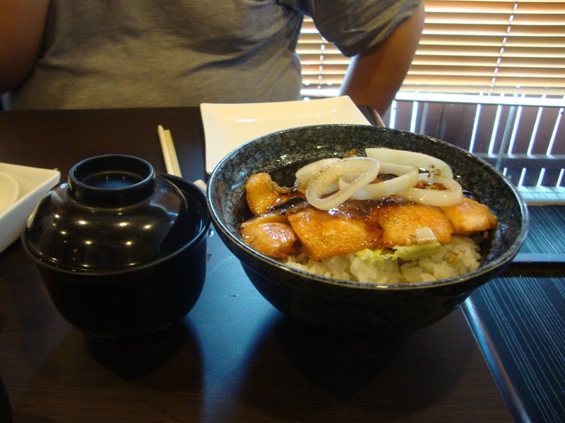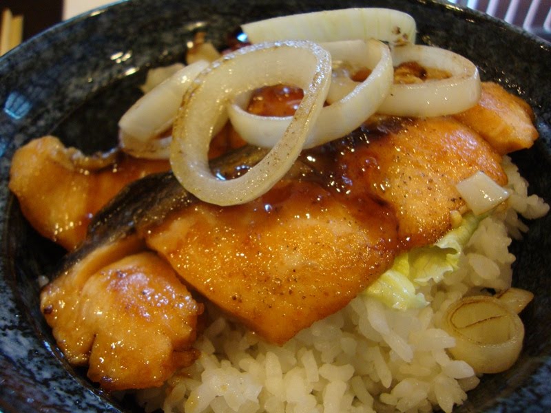 This is what my friend ordered: Salmon teriyaki don (I think). Too bad the waitress took away the bowl cover, because it had a very beautiful interesting sakura flower design on it. The salmon itself looked rather appetizing, but I'd prefer to eat my own