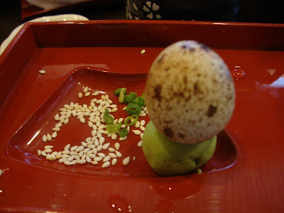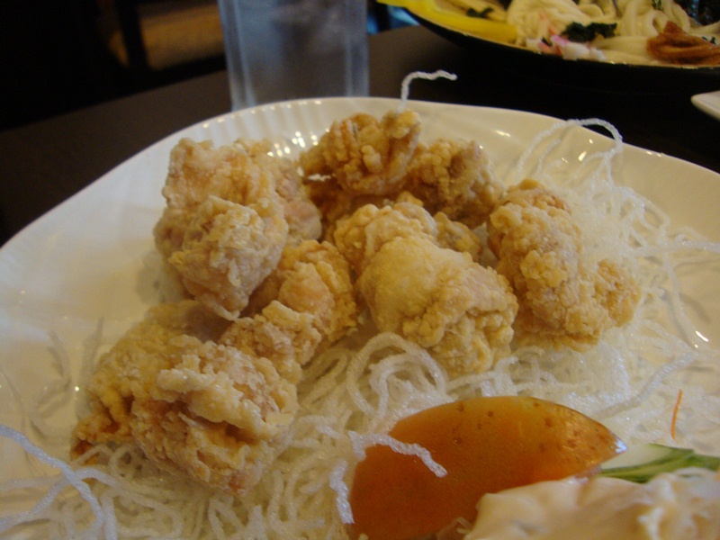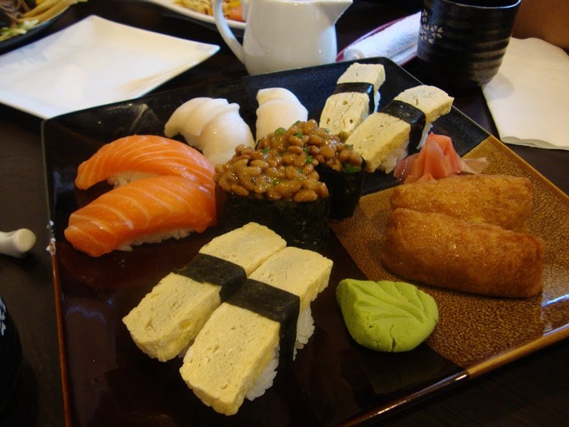 Here be our sushi order as side-dishes. The only beef we have about this place is that they do it rather slow, even for the sushi. Sushi-s are supposed to arrive first before the main course, not the other way round, but anyway, at least it's here. Apparently they don't serve them in the usual colour-coded plates, but in bulk. So we had salmon shake, tamago shake, roe in tofu skin (or something like that), butter tuna shake and nato sushi.