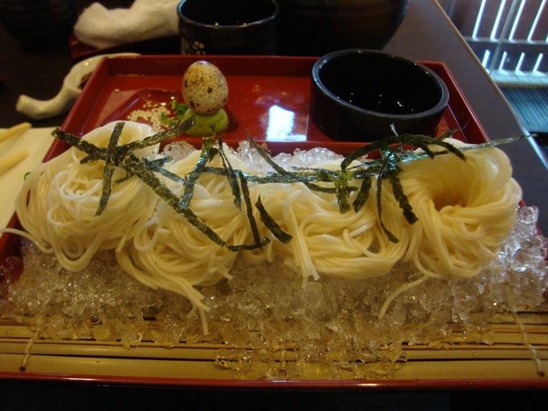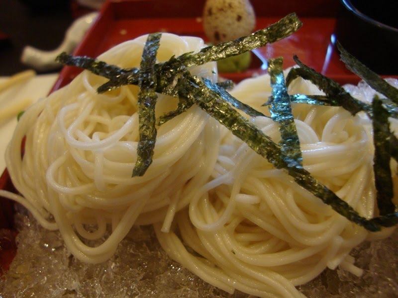 This is what I ordered: Hiyoshi soba (or I THINK that's how you spell it ^^;; ). I had a craving for soba but I was bored of cha soba (green tea soba) so decided to try this one instead. It's thinner and a little clumpier because of the lack of moisture, but tastes great more or less. I always find soba intriguing that eating it alone as it is has no taste, but dip it in the cold sweet sauce (that you have to crack an almost solidified cold quail raw egg and mix it together), and it tastes great