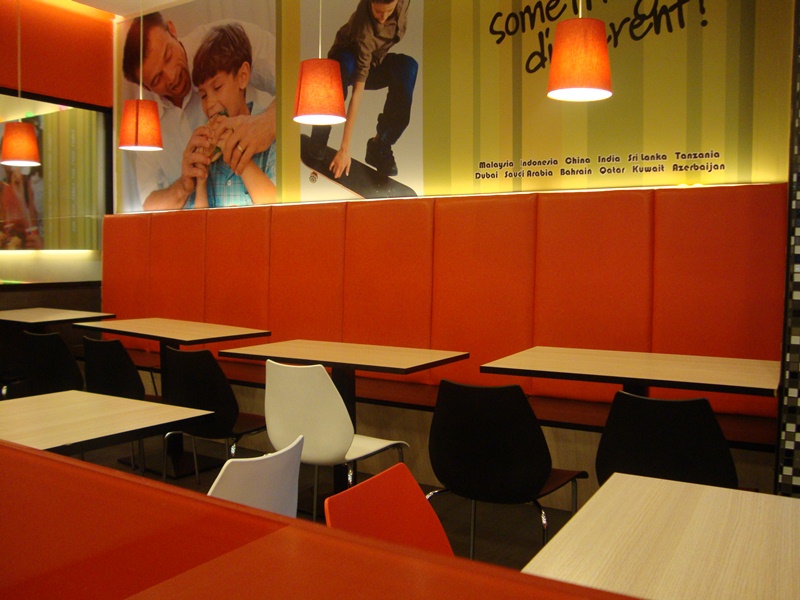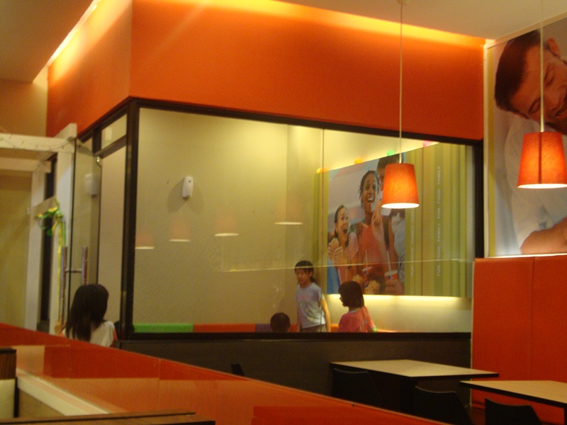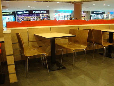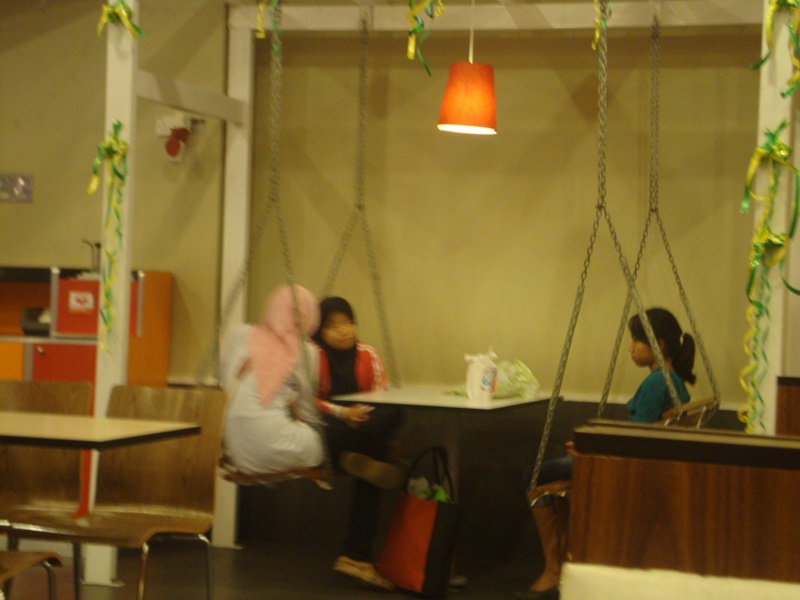 This be the interior design of the fast food restaurant. Looks very orange and white-themed, and they've got a playroom for the kids to distract themselves and got an interesting swing seat. Wanted to sit there but then it would probably be hard for us to eat with all the swinging involved XD