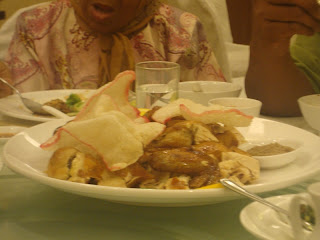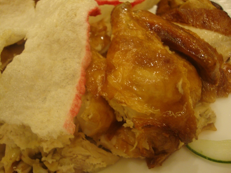 We also have the roasted whole chicken (minus the head, of course) buried in a mountain of prawn crackers aka keropok. Tastes pretty good, though just a liiiiiiiiiiiiiittle bit dry, but amazingly yummy if dipped in soya sauce mixed with cili padi. Nice and spicy. There's the plum powder actually but looks like not everyone is a fan of dipping their chicken on that