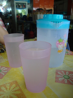 A pot of water for you to wash your hands before you eat. It's a Malay culture style thing