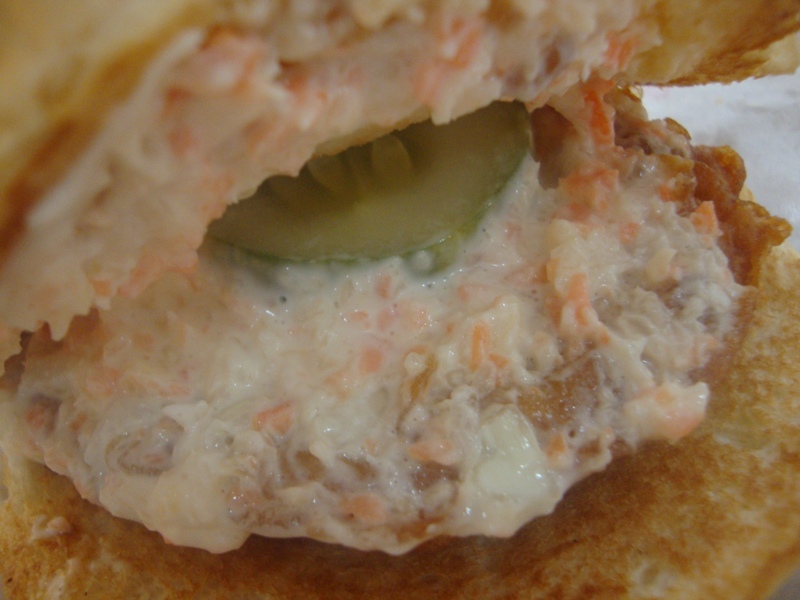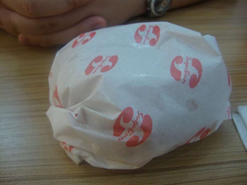 My friend's burger that I have "molested" trying to take a picture XD Interesting though that instead of the usual lettuce, cheese and tomatoes, they had cucumber and coleslaw for the filling, though I totally forgot what was the meat