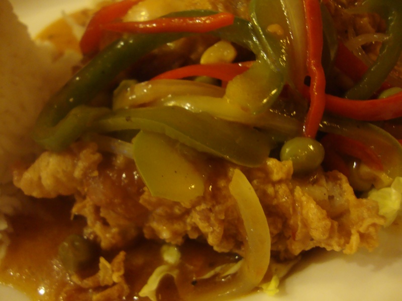 I think my friend ordered pepper chicken or something (can't for the life of me remember what it was), and it looks pretty tasty, though it's sad that she doesn't eat the green and red capsicums, and I think I snagged a few from her, which gave me the taste of the sauce, and it's actually quite good. Got a small kick to it