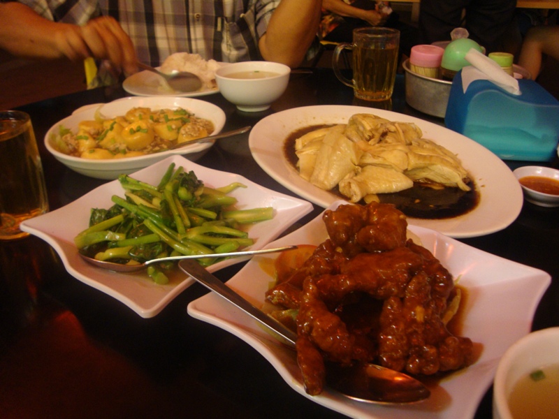 Food: Half a steamed chicken, Japanese tofu, veggies and pork ribs with servings of rice