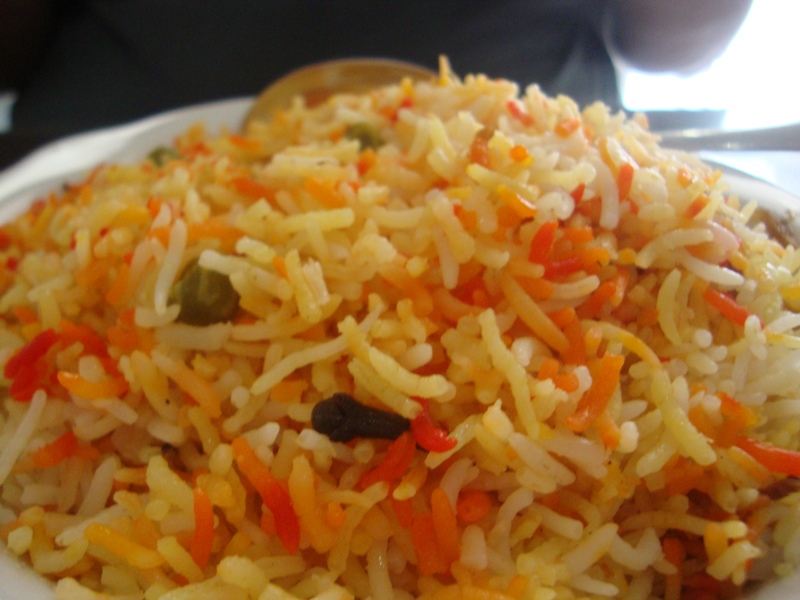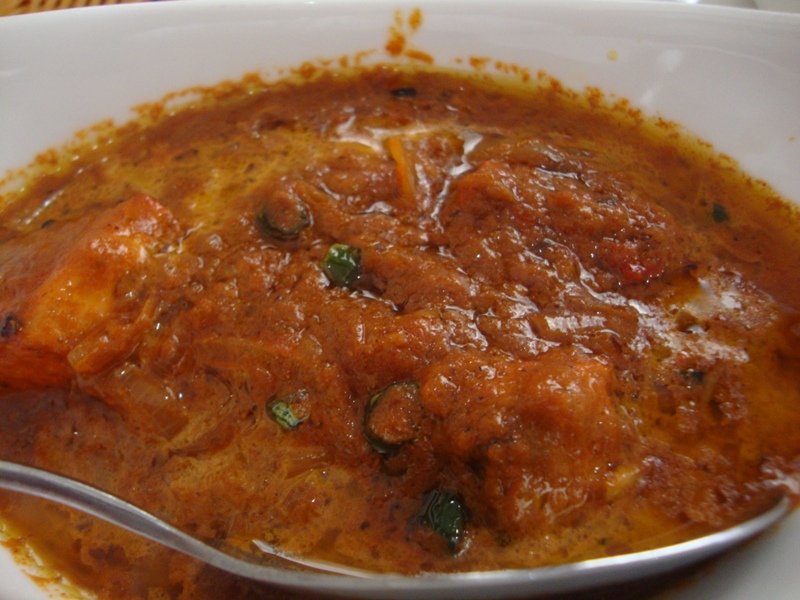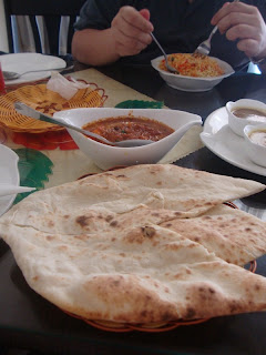 Food: Chicken briyani with rice (my buddy) and fish masala with nan (mine)