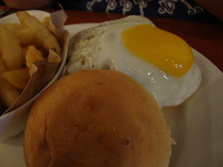 | My buddy's Royal Joe, basically a high-classed version of Sloppy Joe with sunny-side up and fat fries. |