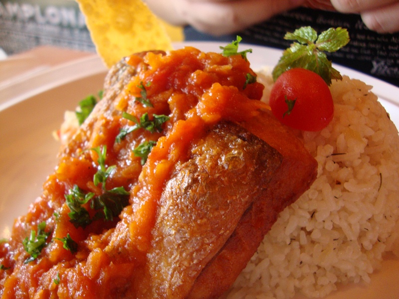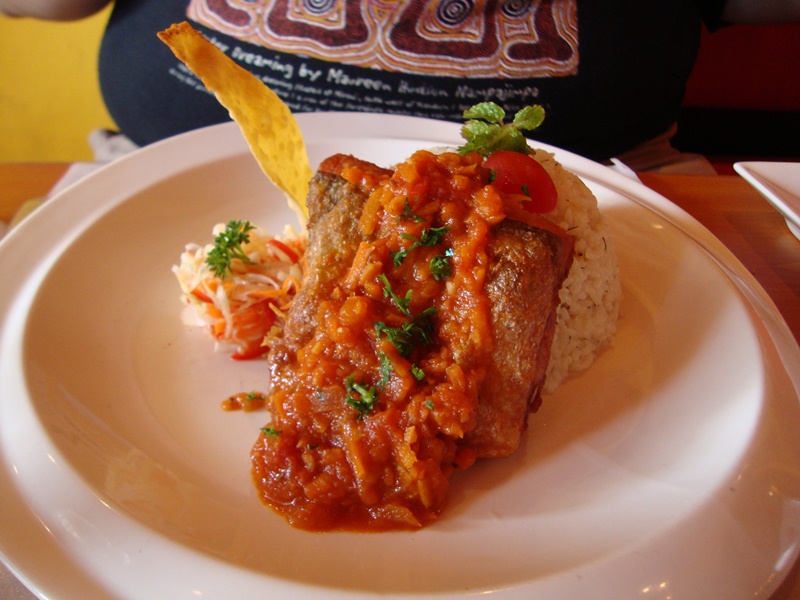 Morish fish my buddy ordered, which is fried salmon with fried rice and tomato salsa sauce (I think), the skin is pretty crunchy |