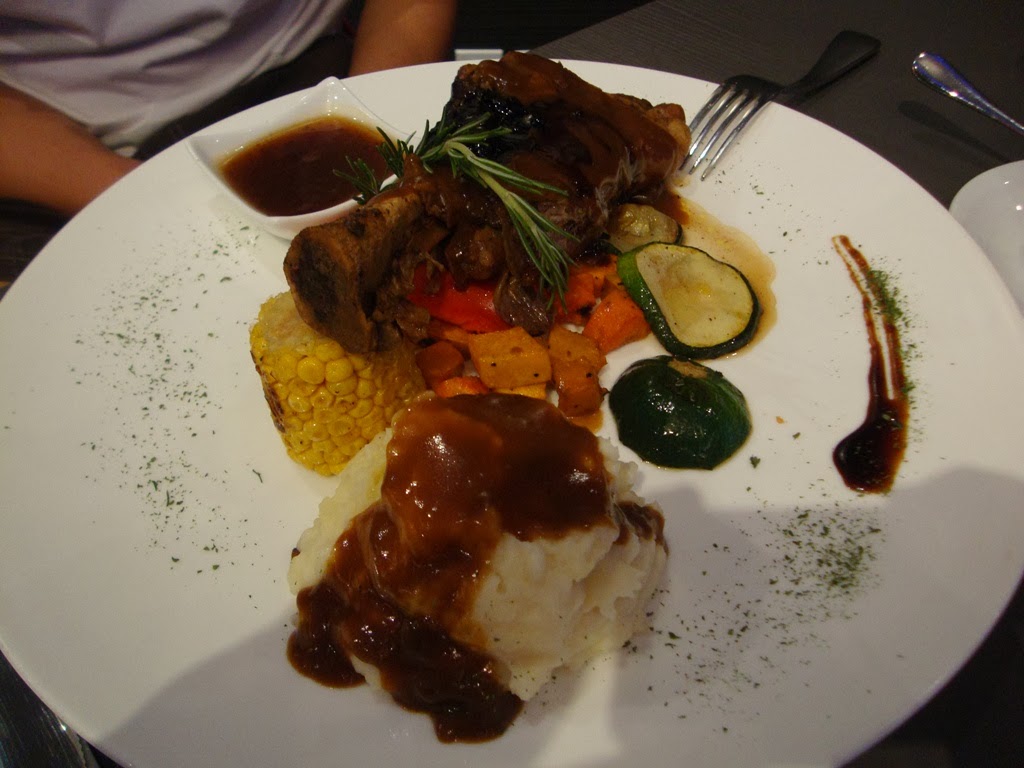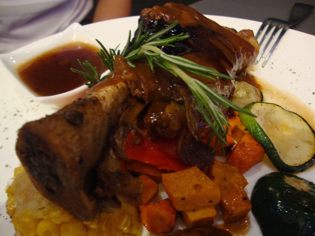 Took a bite out of his lamb shank. Gotta hand it to them, it actually tastes pretty good. The sauce is right: rich but not too much and just the right thickness, though the veggies needs a little work