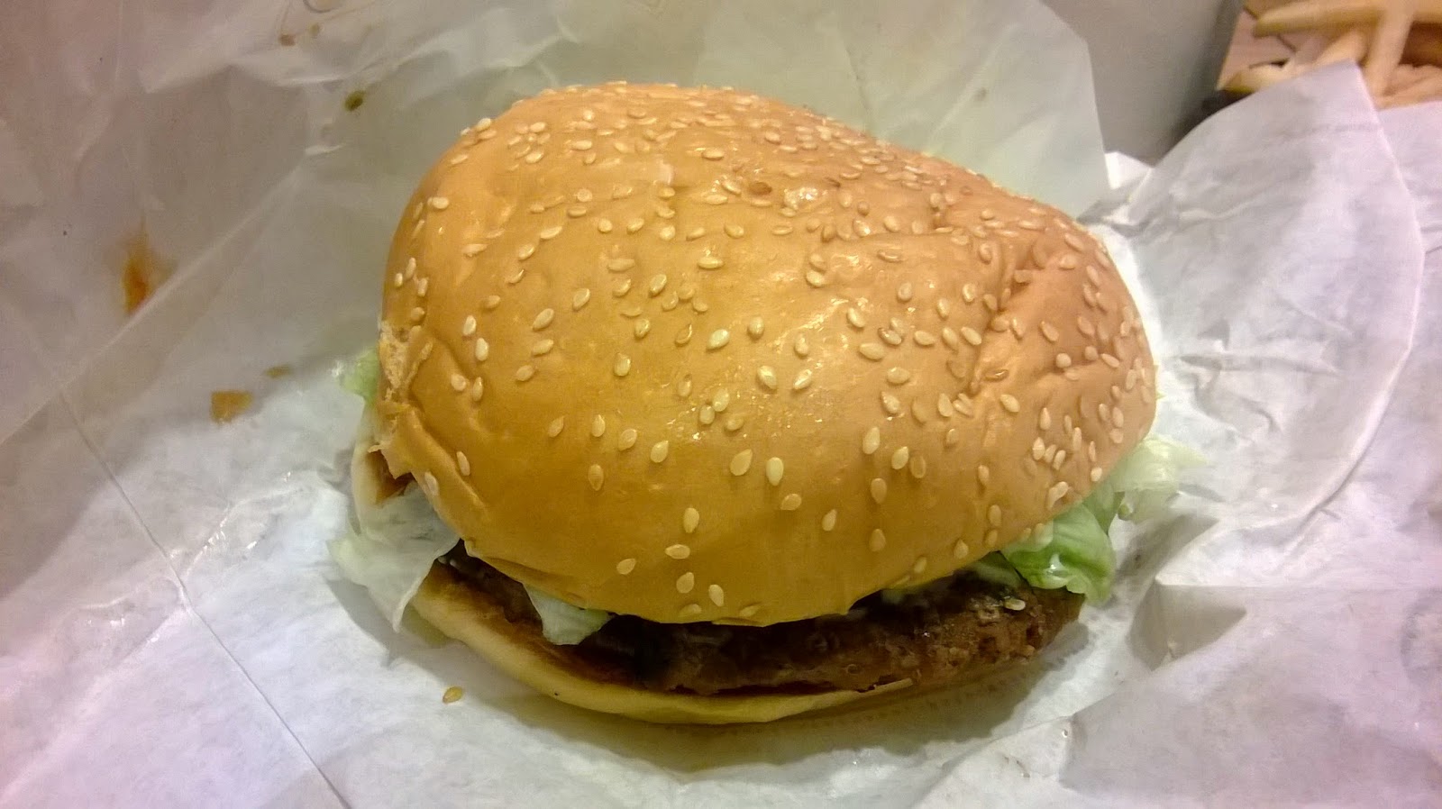 I was determined to sit there and have my meal like a decent human being because I don't want my burger to go all soggy by the time I get back home to eat it. I had my eye on every single seat to see if they are leaving or not (and missed one because my hubs didn't think that it's worth taking). Finally my patience and vigilance paid off when I spotted a counter seat just right next to me in my line, and I took that great opportunity and grabbed the shit outta that seat. After waiting a while, my hubby finally survived the long line and brought our ordered food.