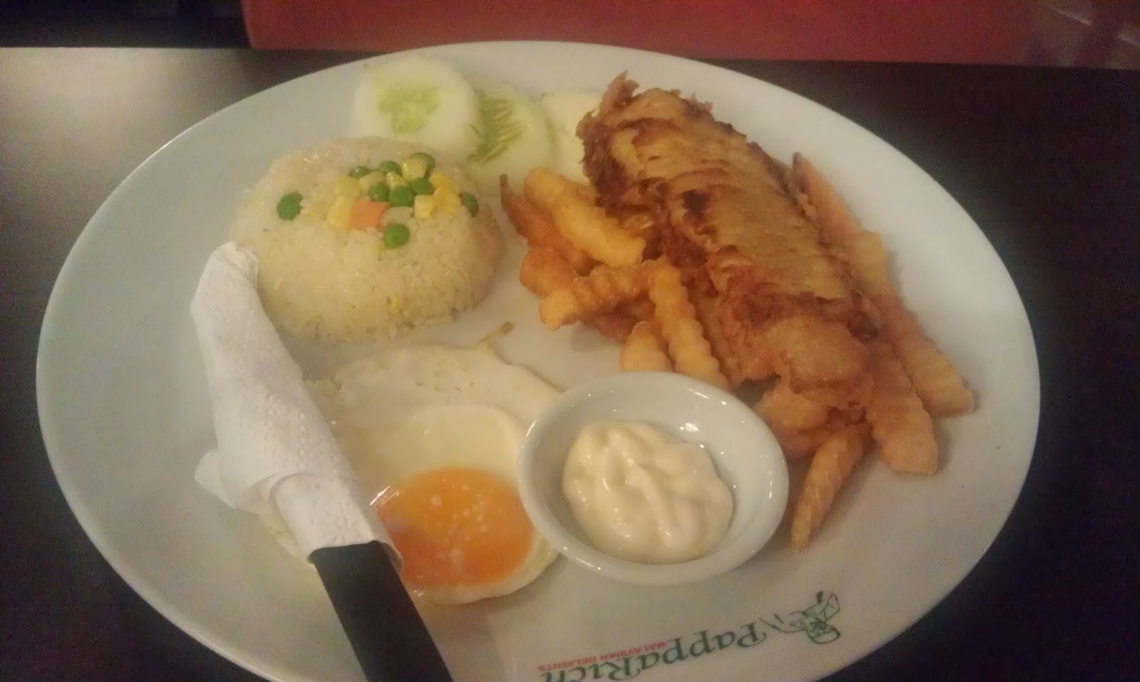 My buddy's food wasn't that too impressive either. The fish wasn't exactly fresh, and it was cooked in a rather bland way, the chips were tough and old and who in the world serves fried rice and sunny-side up eggs with fish and chips? Are they trying to create some sort of fusion? American fried rice with fish and chips kind of dealio? I'm all about fusion but this is just too weird, even for my tastes.