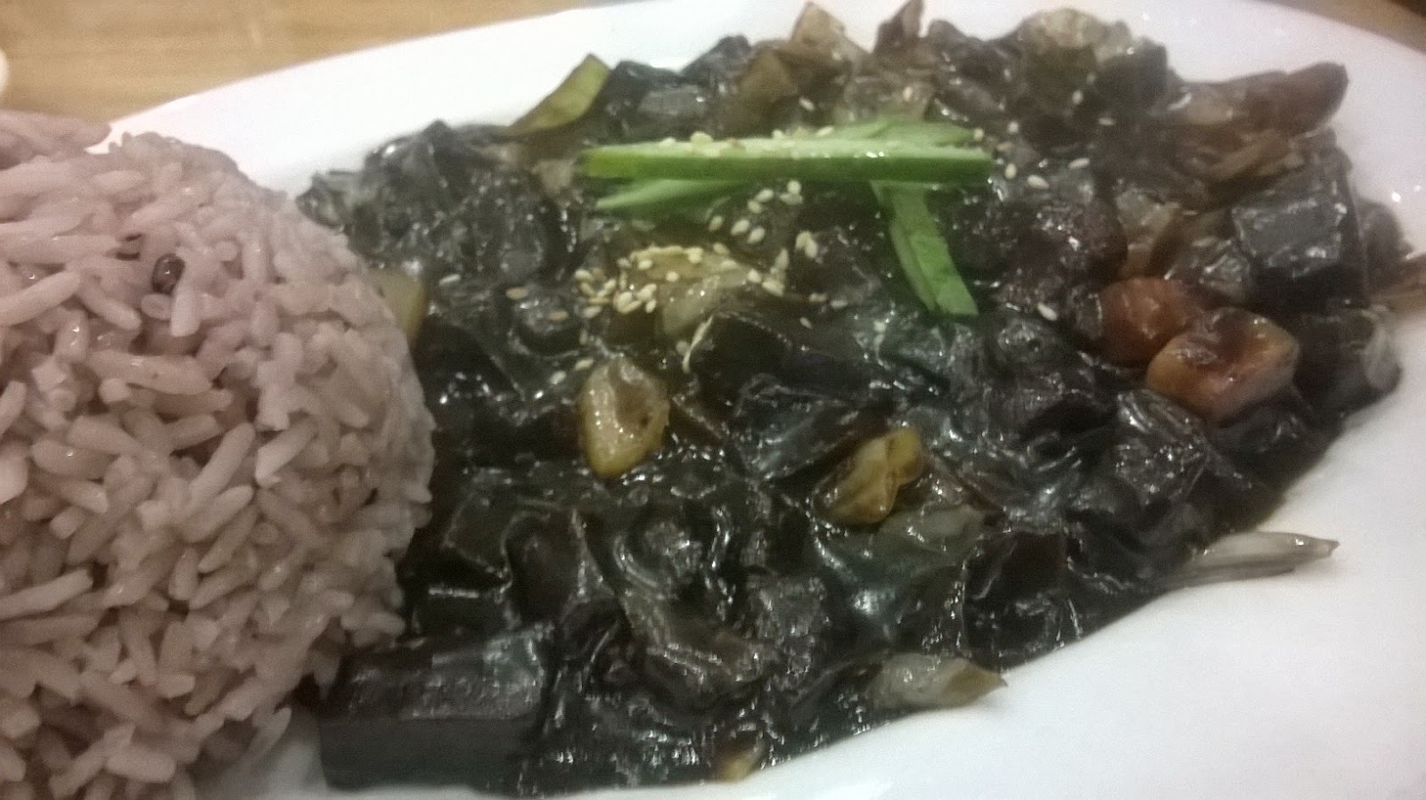 His dish consists of brown rice and seafood and meat and potatoes with a hunka load of black sauce. It's so black I couldn't make out anything until I tasted one of the food. LOL