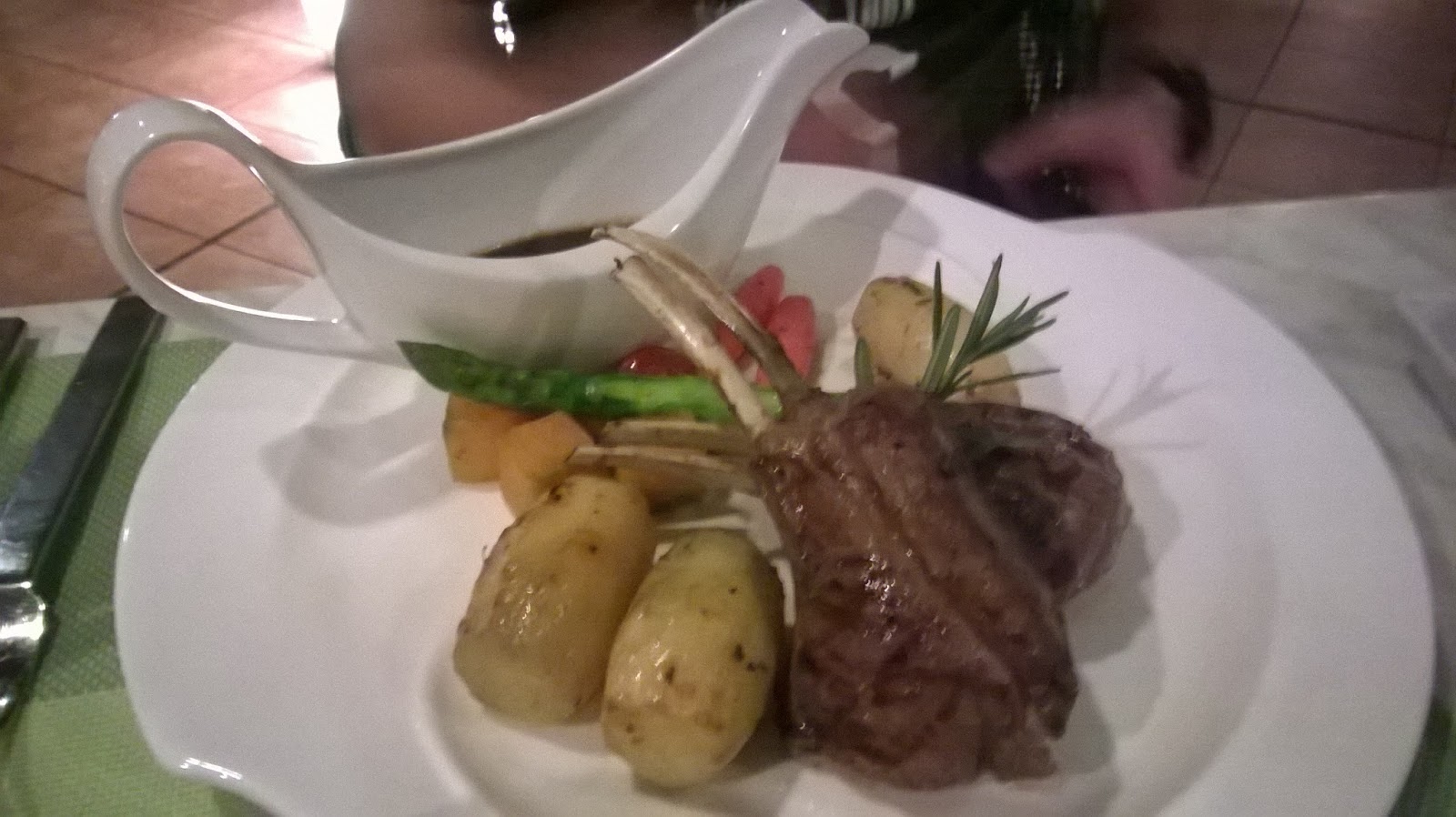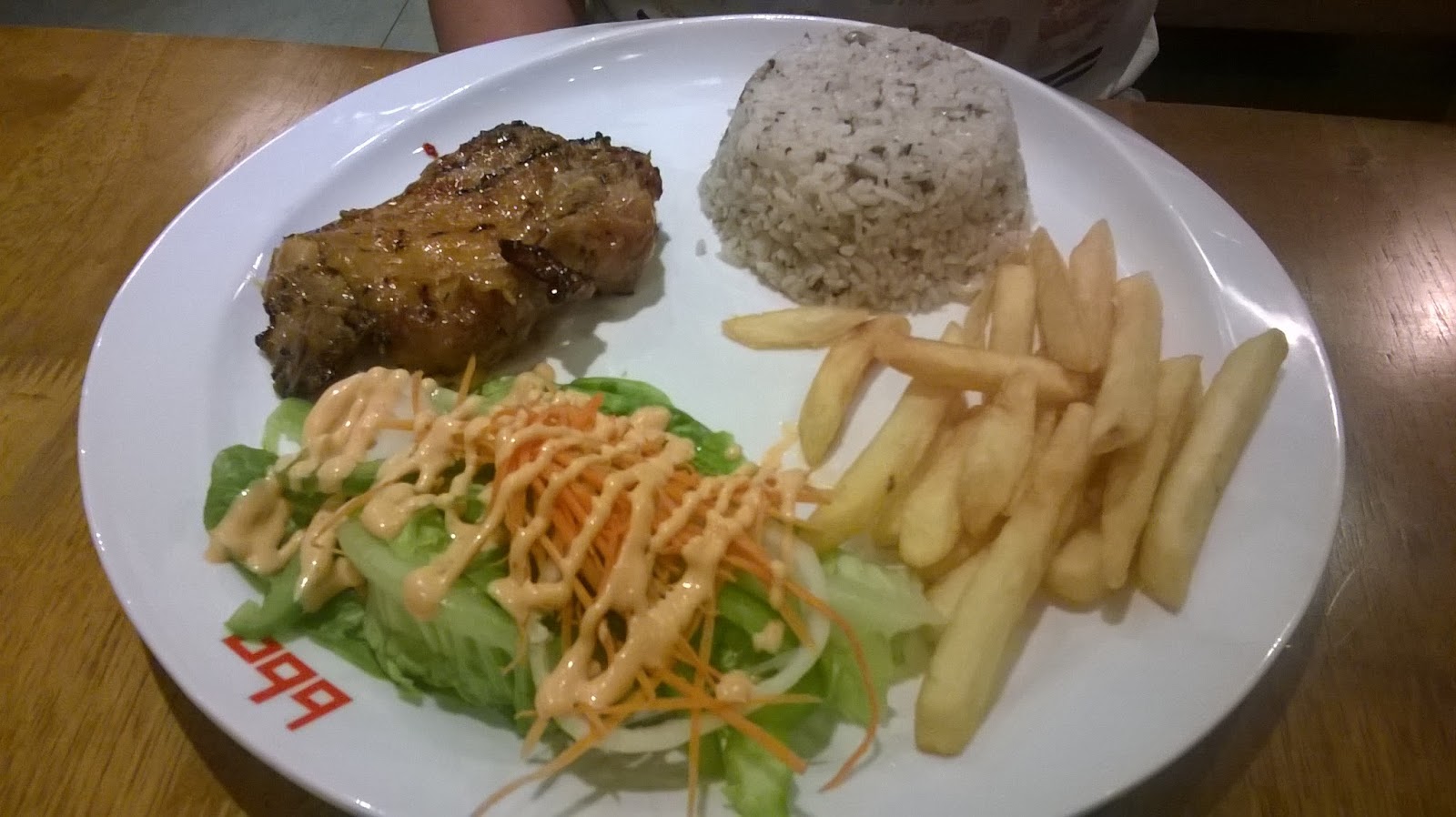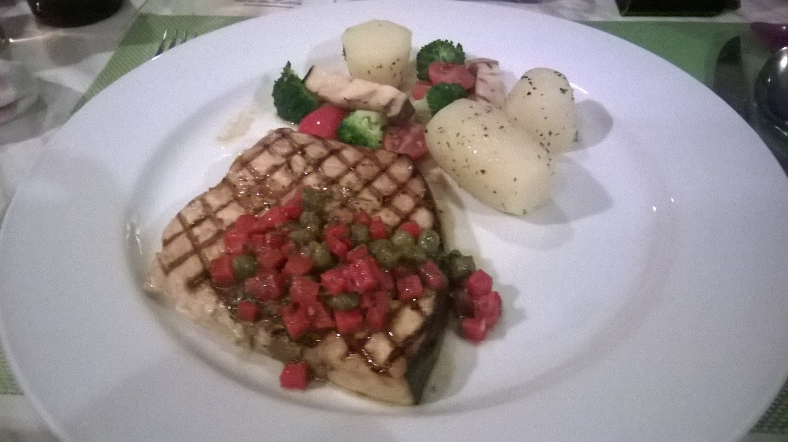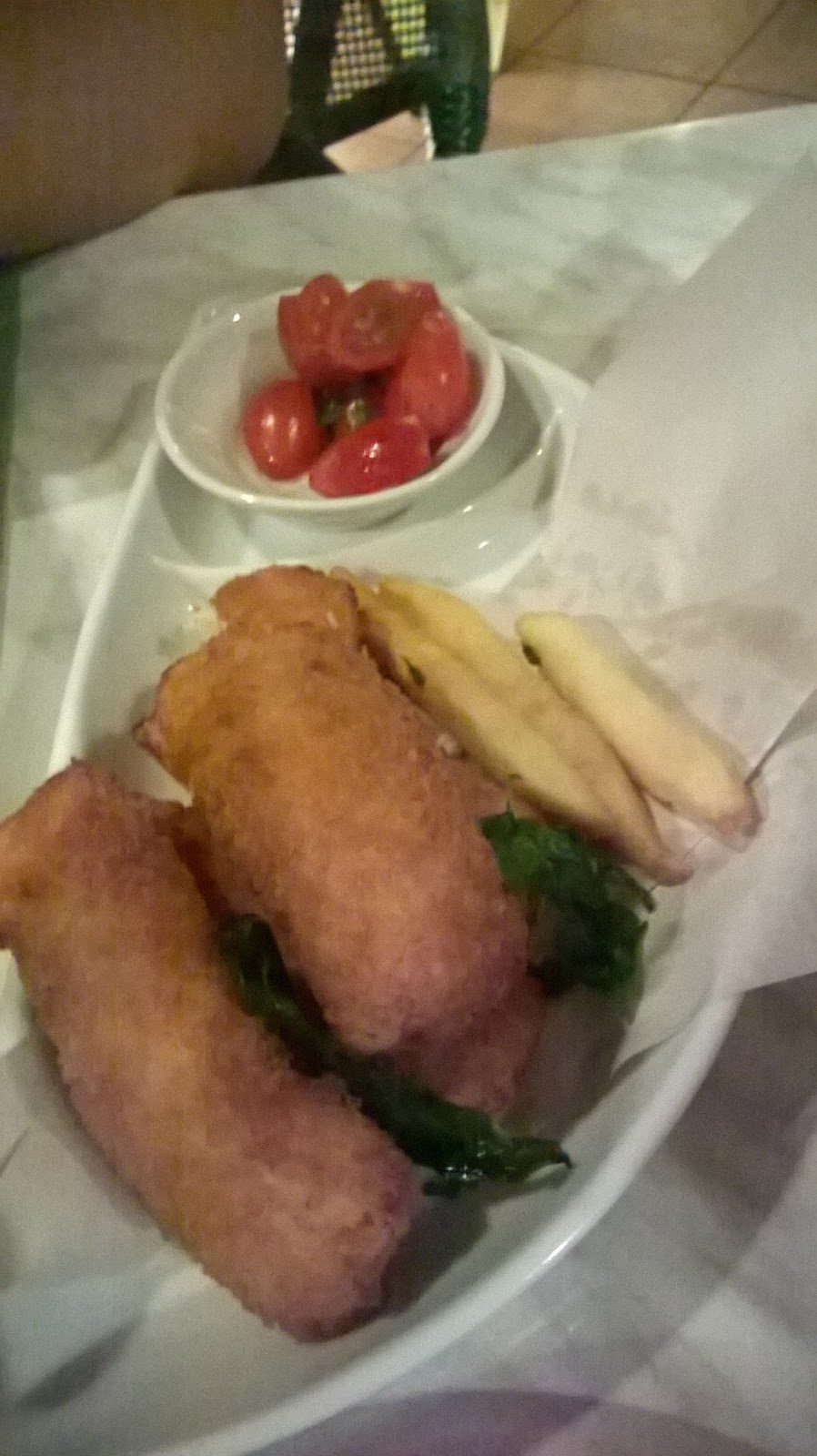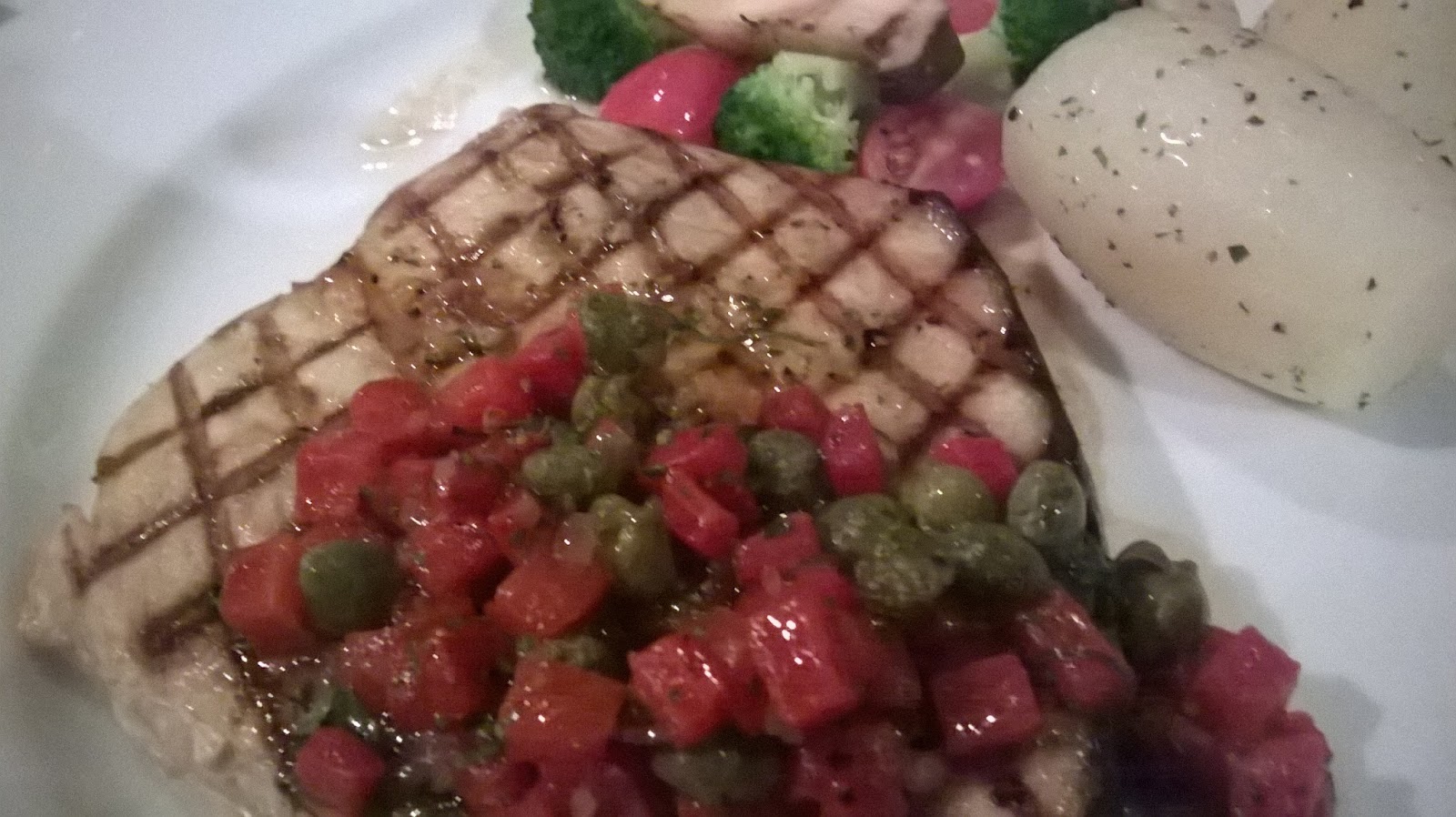 Tastes slightly dry a bit, but not so bad, and it's nice and fresh, and the skin is relatively crunchy. Yummy and delicious, and the vegs were pretty good too. Although it was a little odd having red pepper and peas as the topping sauce for the fish, it pretty much compliments it and tasted amazing. SO worth the money ordering this.