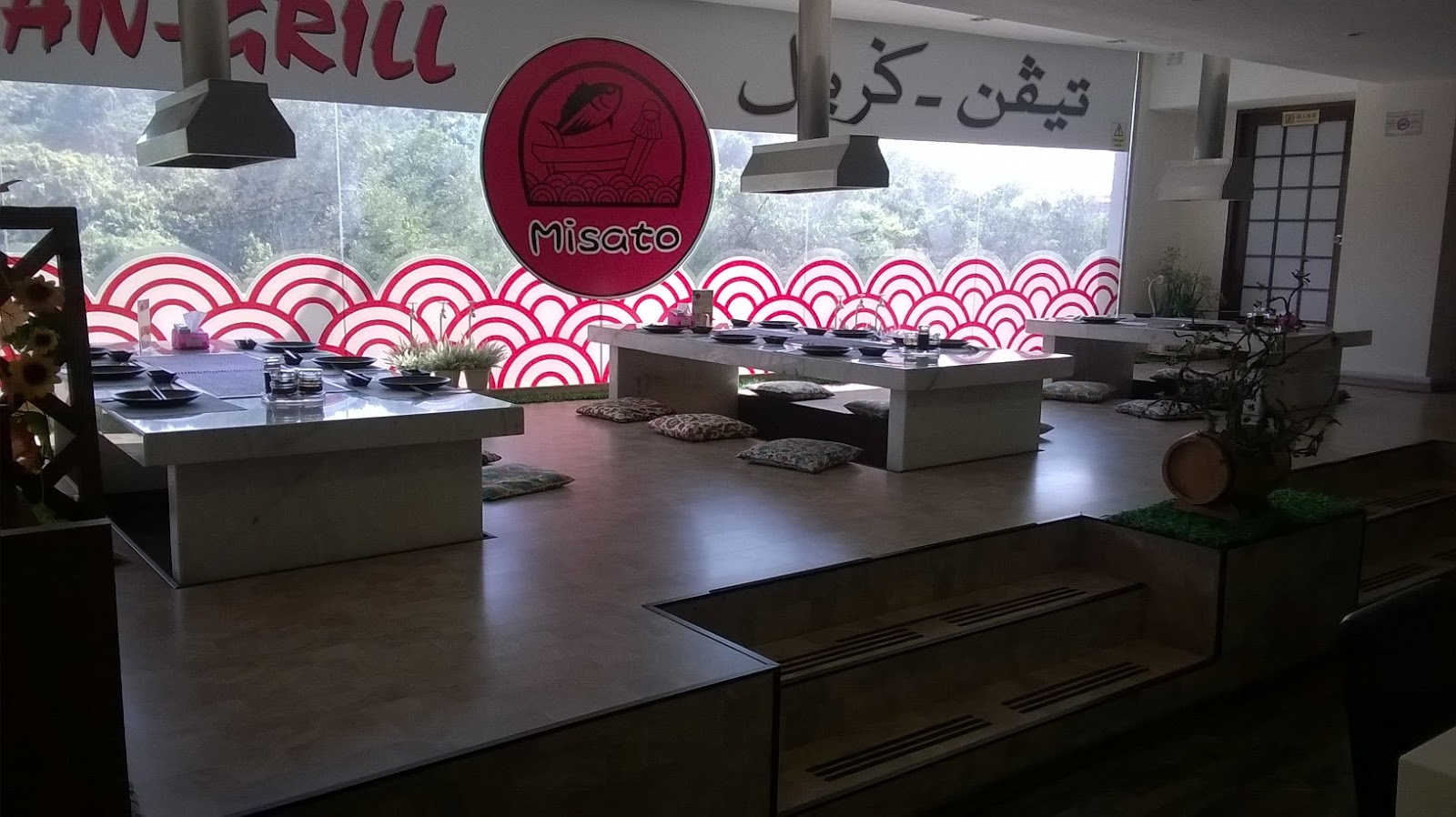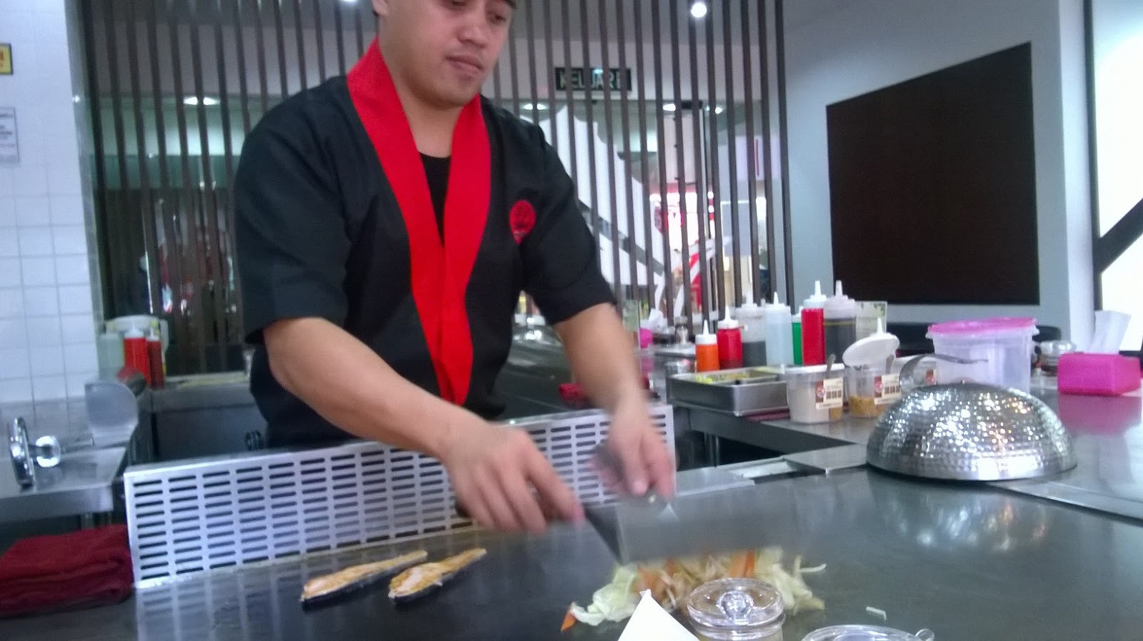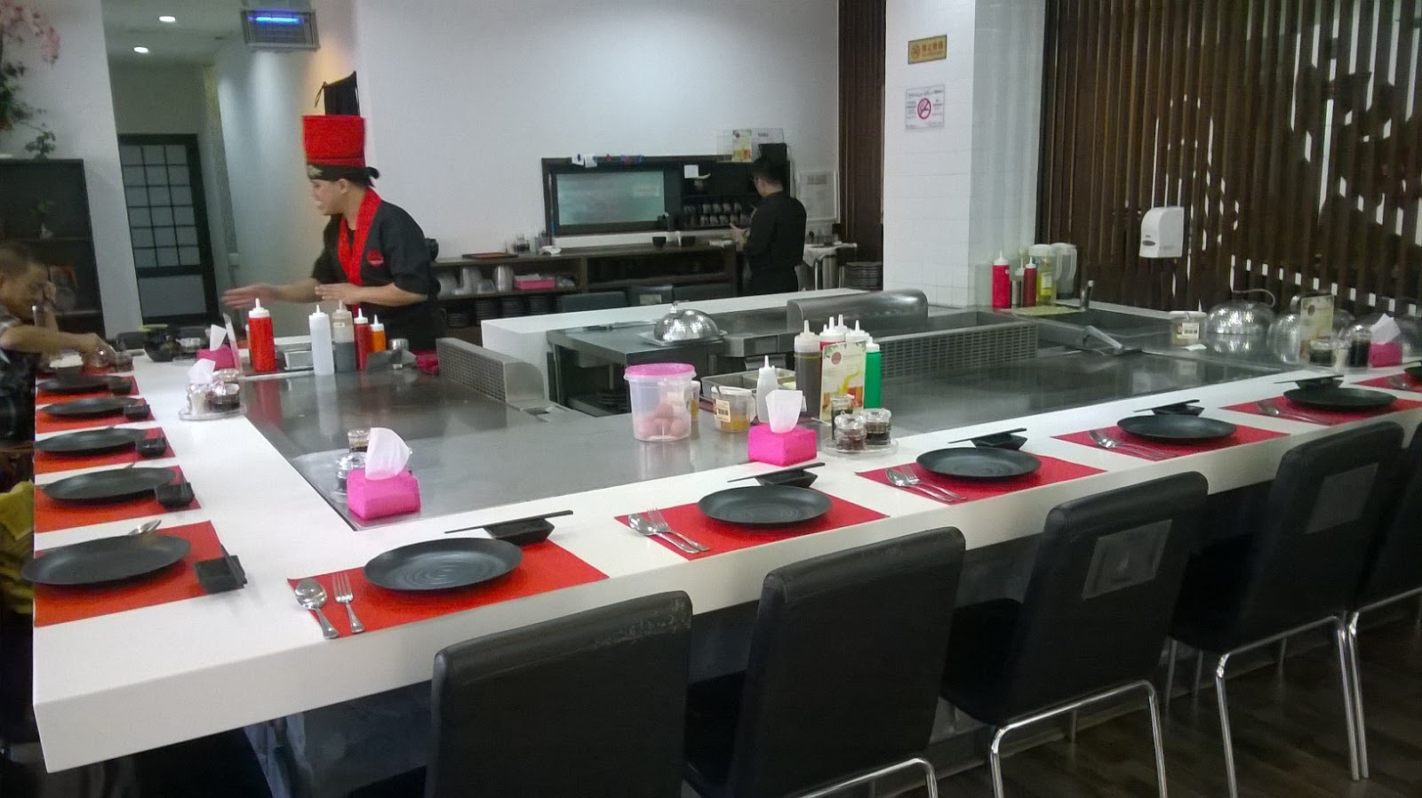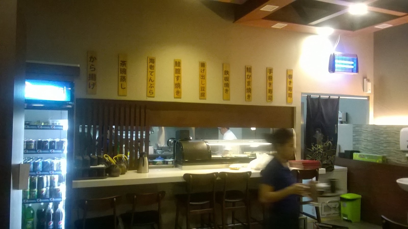 | Setting: A nice Japanese themed design, with Japanese Kanji-written menus on the wall of the counter |